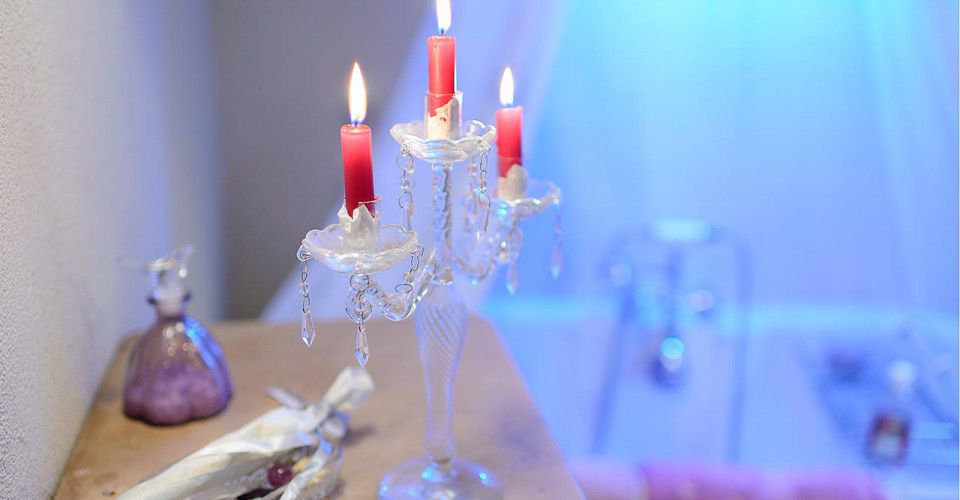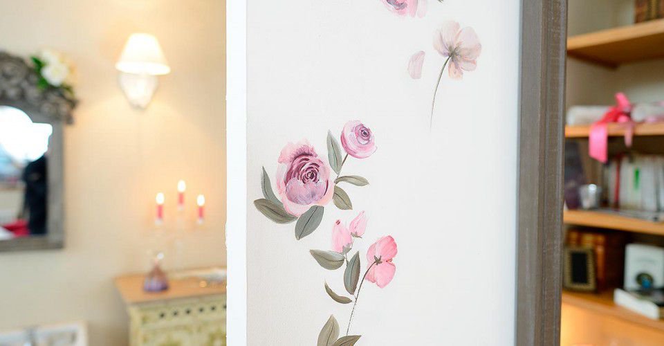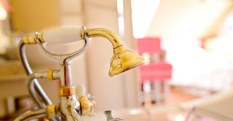 Une arche, entourée de roses, donne sur une ravissante salle de bain et sa grande baignoire pieds de lion.