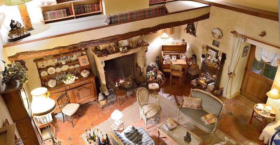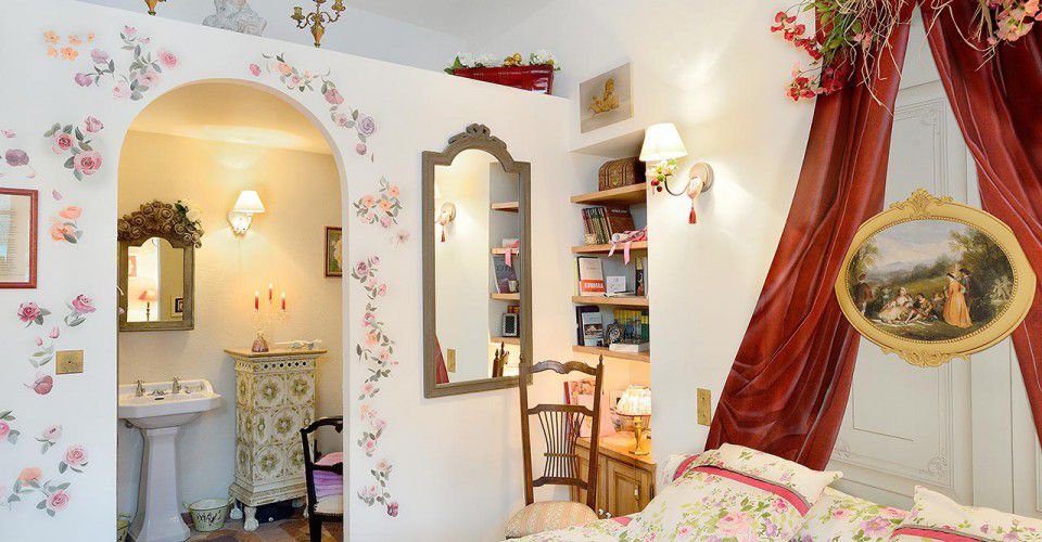 Chambre « Entre Ciel et Terre », charmantes chambres au style un peu « Petite fille modèle » ou parfois… un peu moins modèles avec anges, roses et petits oiseaux où il fait bon rêver… et lire car comme toujours A l’Ombre Bleue, les livres sont partout.