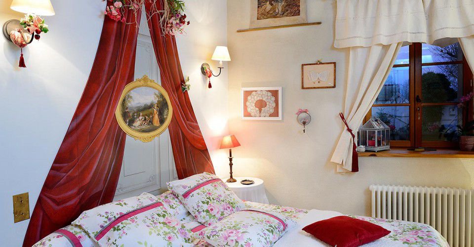 Chambre "des Muses", superbe chambre à l’ambiance XVIIIème siècle, grand lit avec, en trompe l’œil, ciel de lit aux rideaux carmin et joli tableau champêtre.
