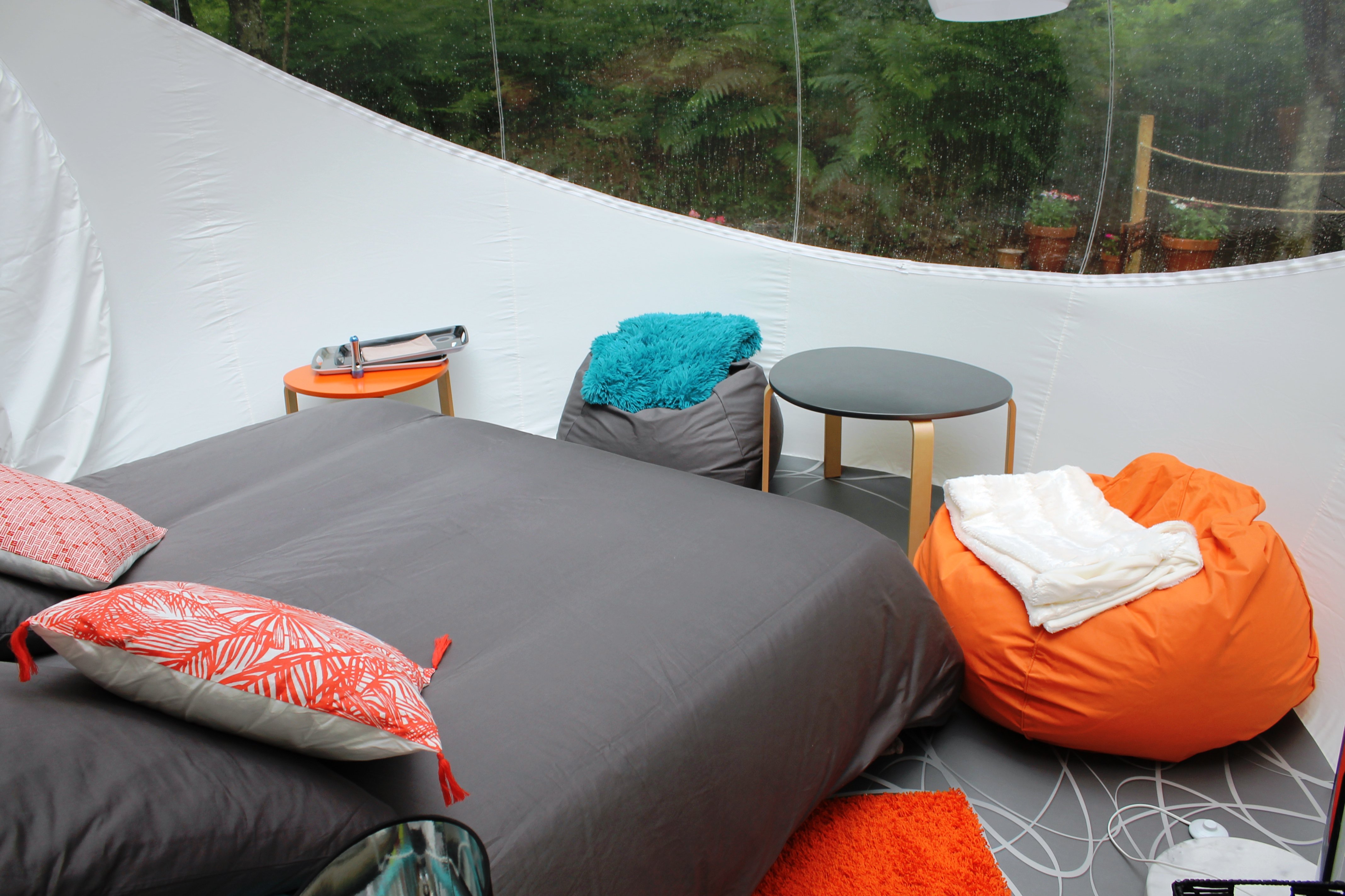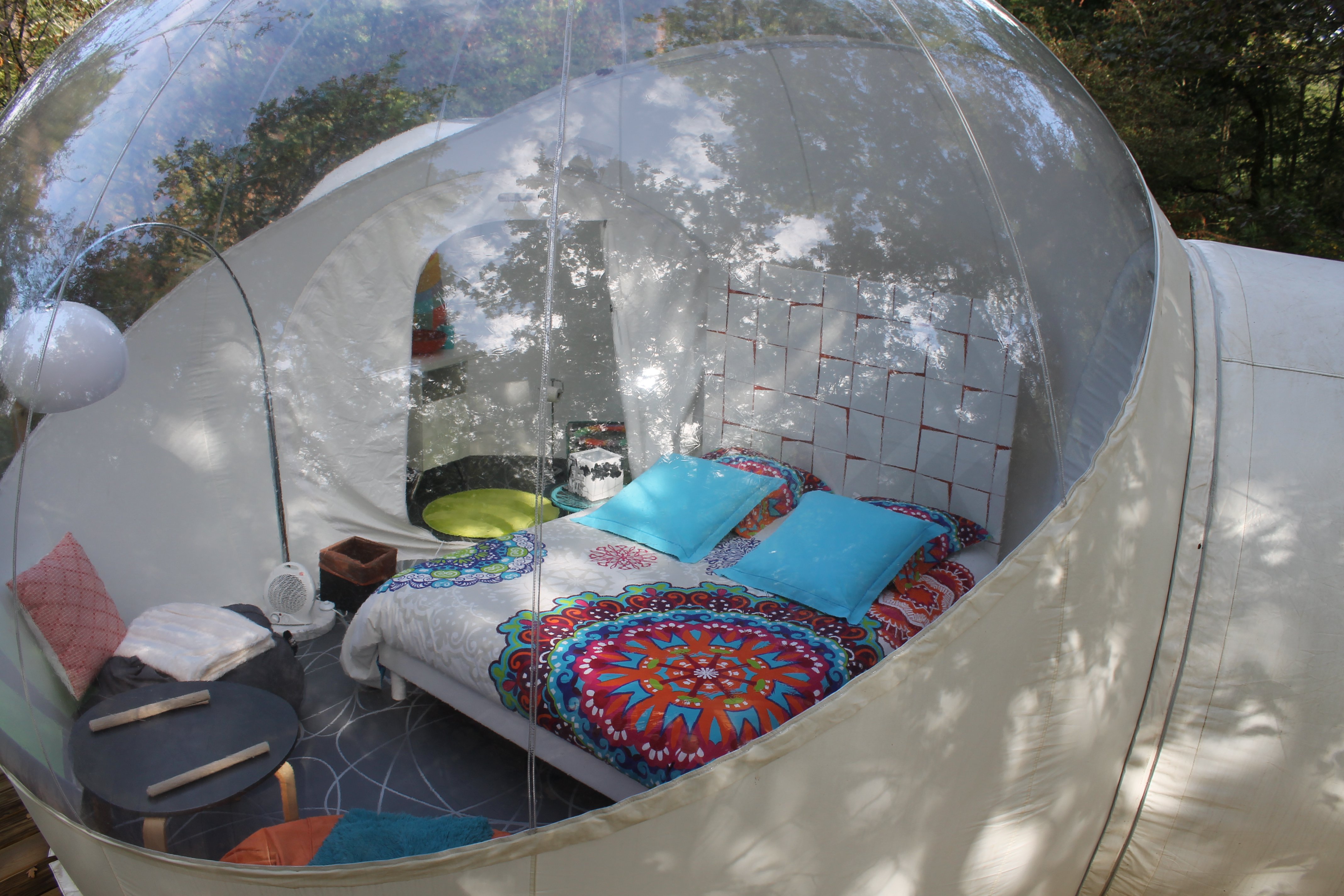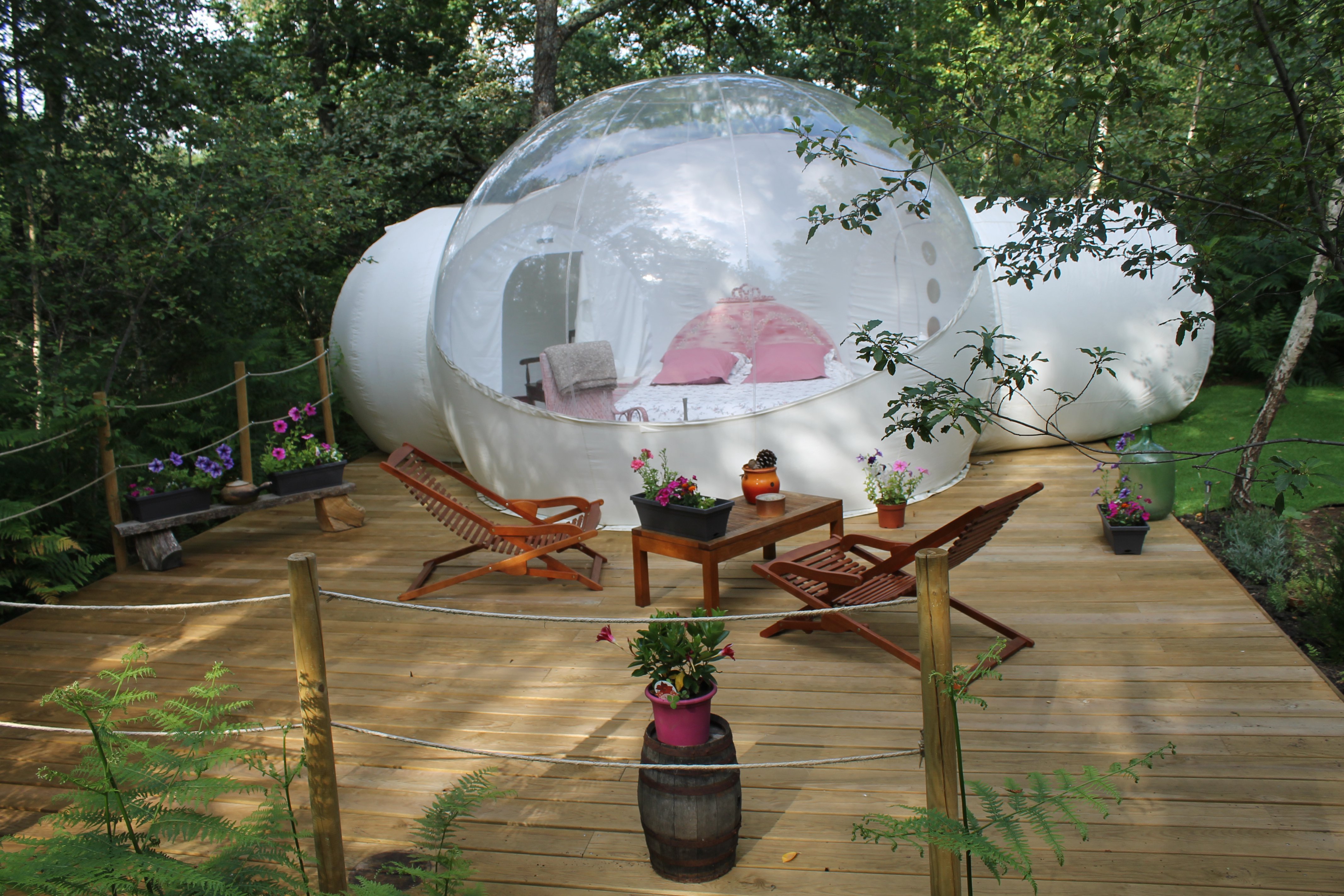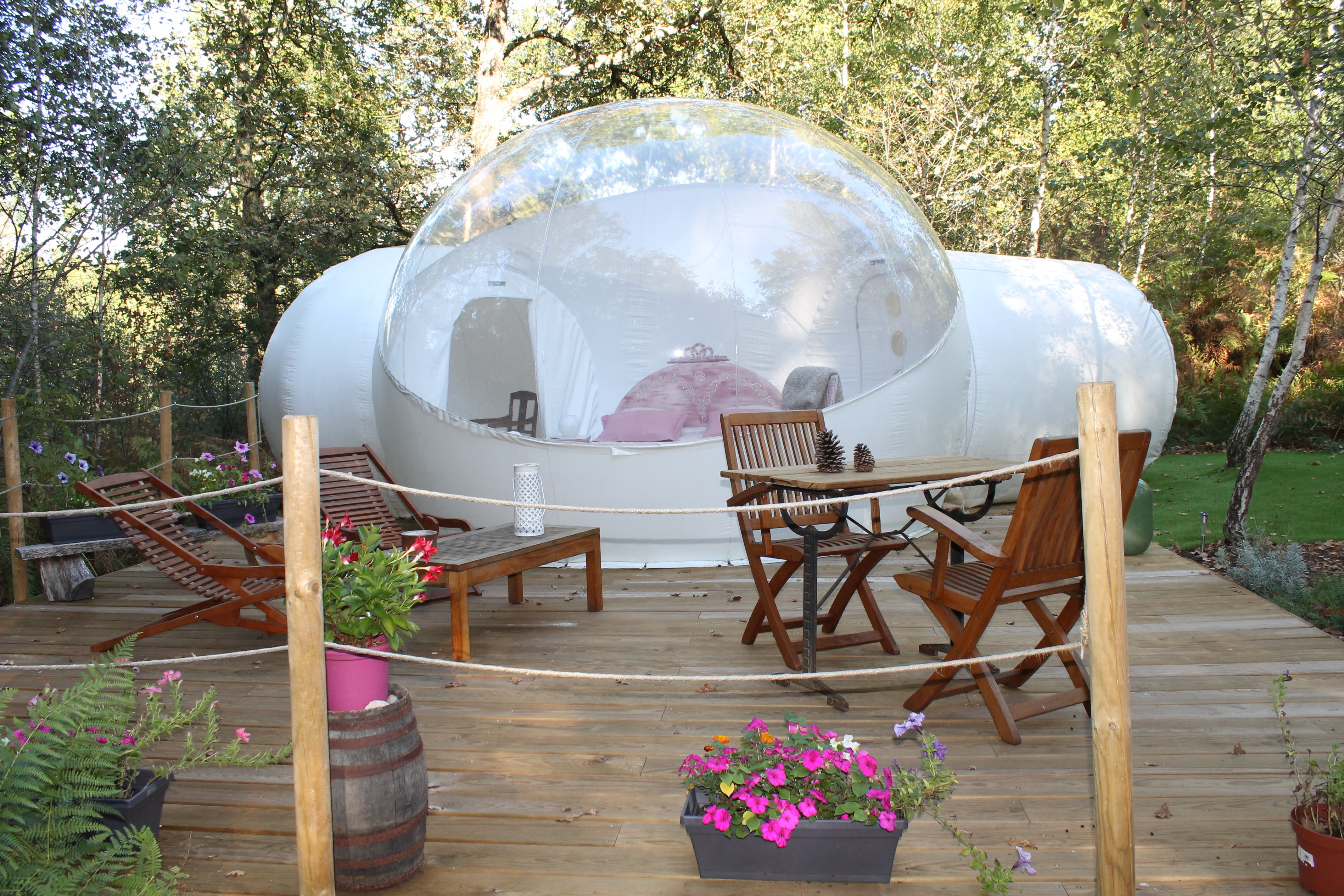 Nuit insolite pour 2 personnes dans la bulle Pop ou la bulle fleurie, apéritif dînatoire charentais (possibilité d'apéritif végétarien sur demande), petit déjeuner compris, le tout dan une bulle transparente en pleine nature pour une nuit confortable sous la voûte céleste.