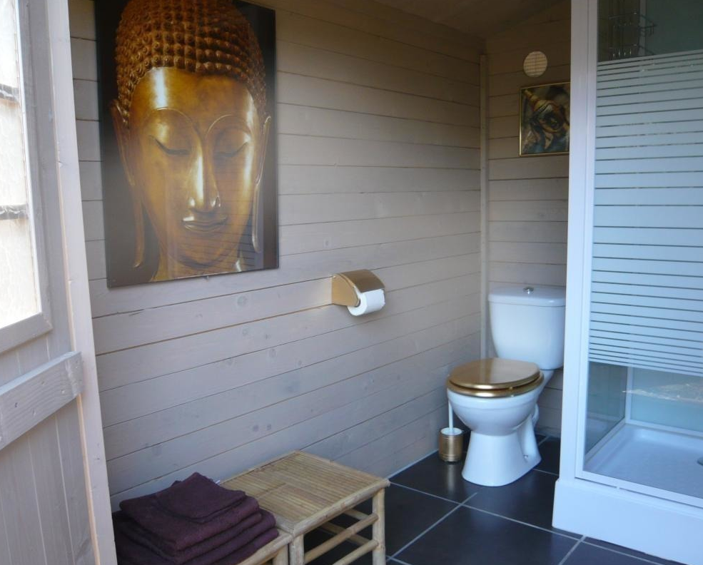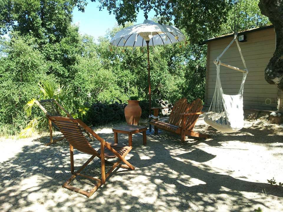 Installée dans un cadre paysagé sans vis-à-vis, chaque yourte dispose d'une terrasse individuelle équipée avec salle de bain privative près de la yourte, table de jardin, hamac et chaises longues sur une vue panoramique et à quelques pas d'un petit chalet en bois privatif.