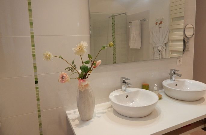 La décoration s'accorde avec les fleurs et arbustes du jardin et créée une atmosphère calme et chaleureuse.