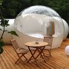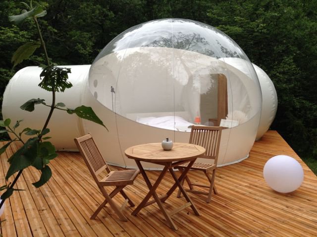 Ambrée est constituée de deux bulles en partie transparentes accompagnées d'un bain nordique (accès privatif et illimité) posés sur une terrasse au milieu d'une clairière !