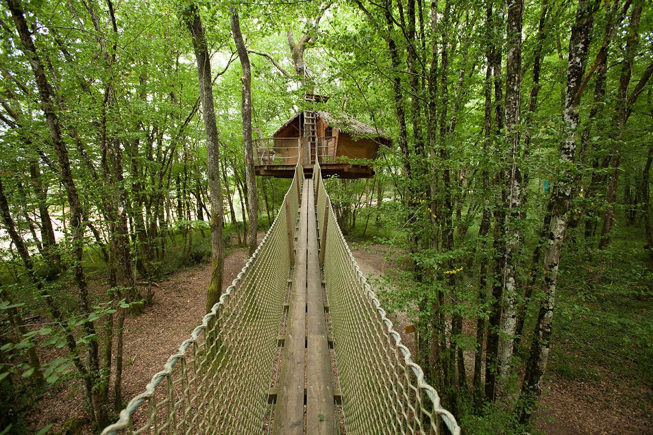 Notre cabane perchée dans les arbres Margaux est accessible par escalier et pont suspendu, et bénéficie en exclusivité d'une tyrolienne !
