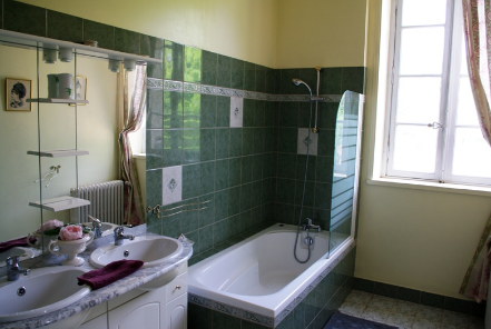Salle de bain avec doubles vasques et baignoire, sèche-cheveux, WC indépendants.
