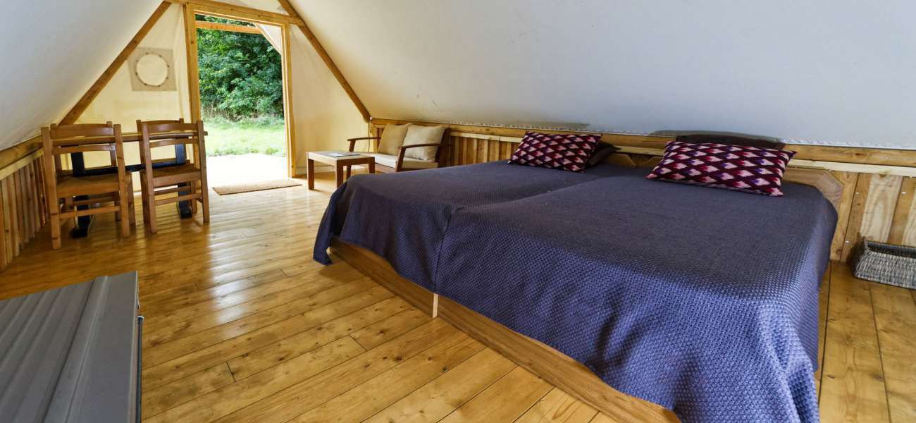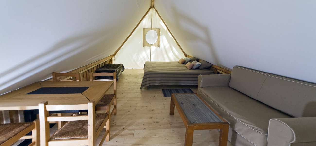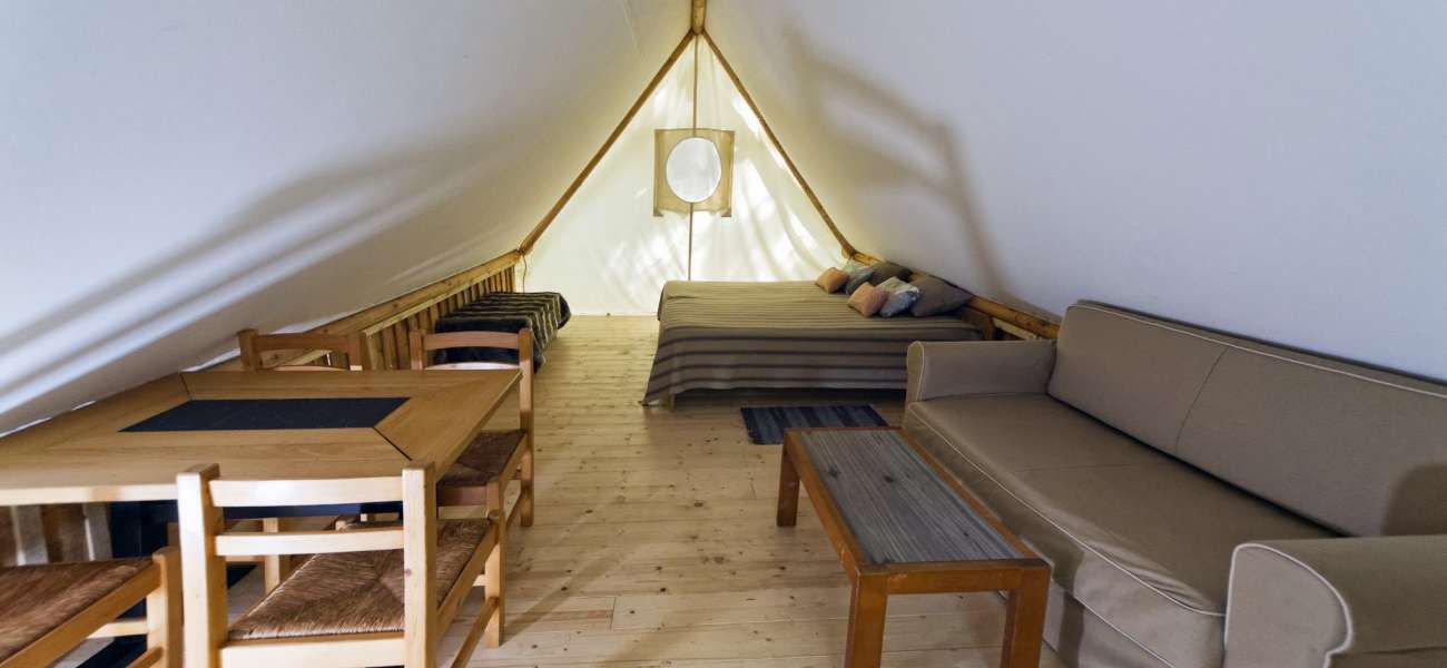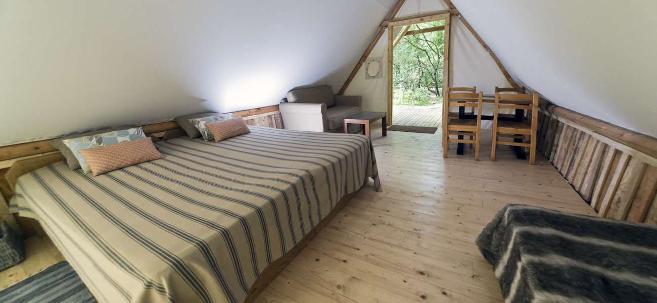 ces tentes canadiennes en toile et rondins de bois de plus de 25 m2 avec 2 lits simples grand confort accolables, un canapé lit double de 140 cm, une terrasse extérieure couverte.