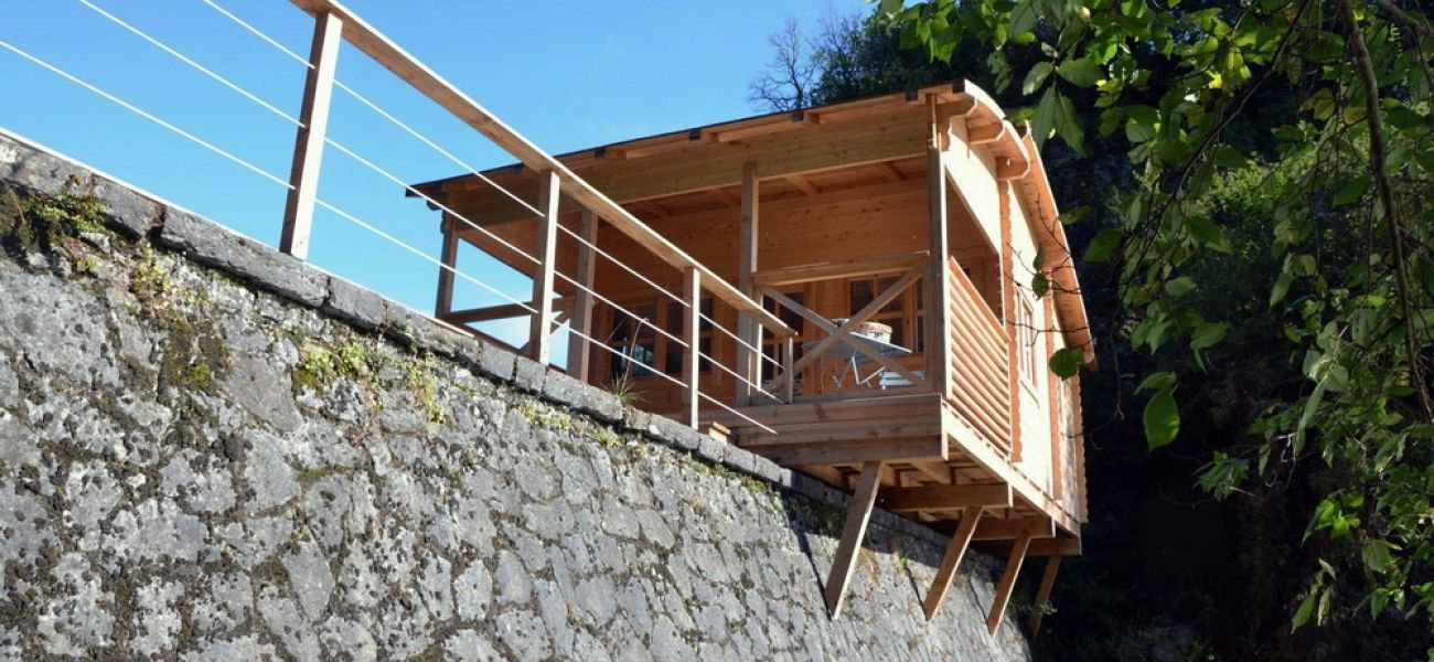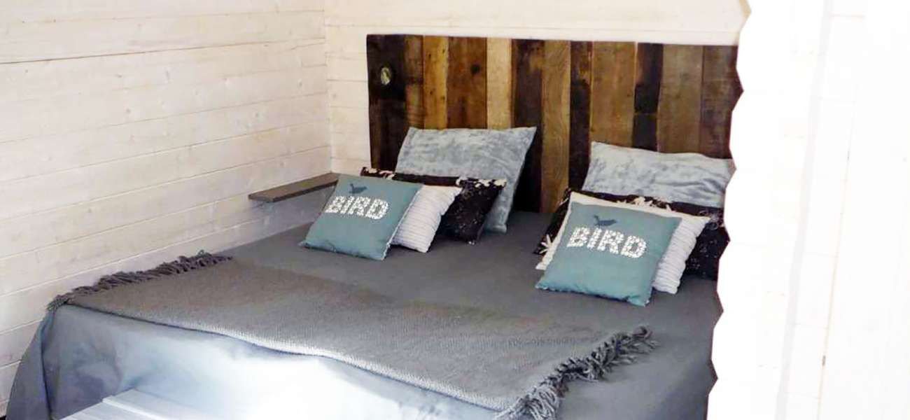 Cabane en bois massif de 20m2 avec 2 lits simples grand confort accolables, un canapé lit double de 140cm, une grande terrasse couverte de 10m2, un coin toilette fermé par une porte avec un vasque + toilette sèche. Eclairage par énergie solaire.
