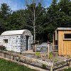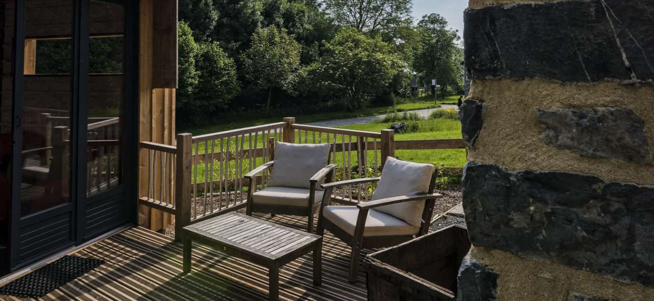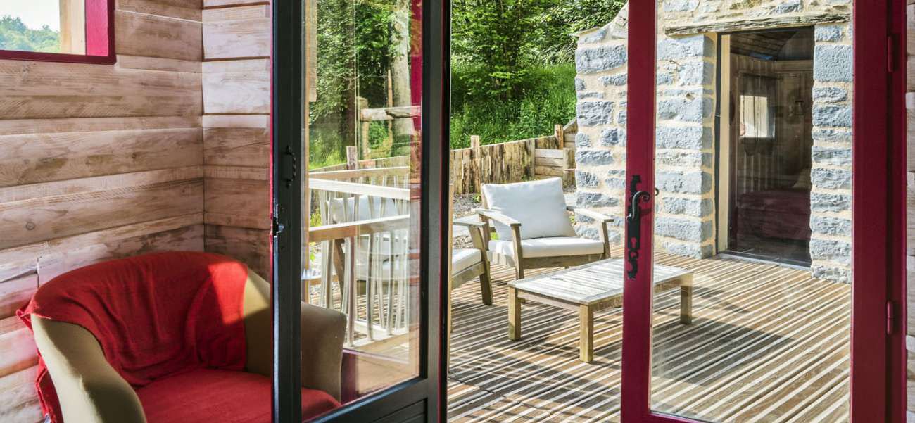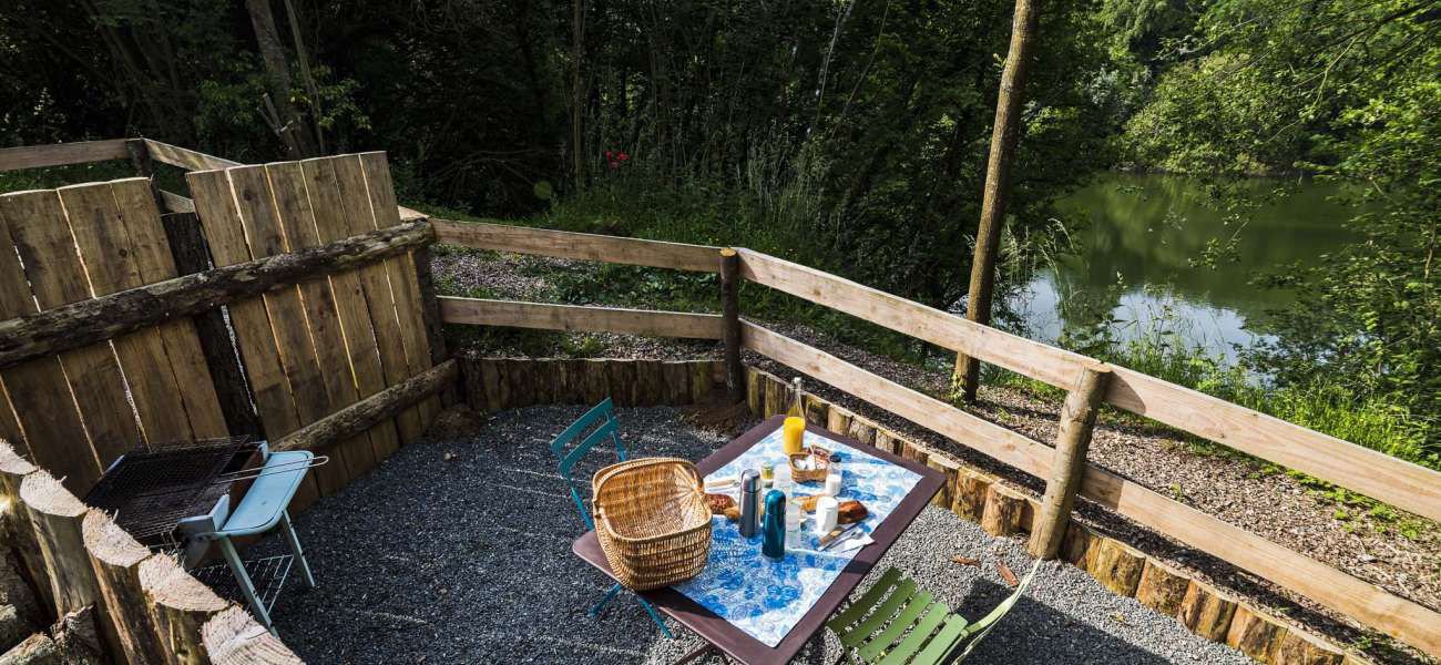 L'extérieur de la Poudrière est aménagé de manière charmante comme si vous étiez dans votre petite maison de campagne privative avec terrasse vue sur lac pour manger et faire votre barbecue, coin relax à l'ombre avec des chaises longues, petit jardin d'arbustes fruitiers pour picorer au grès de vos envies et la saison, et même un petit enclos avec des poules