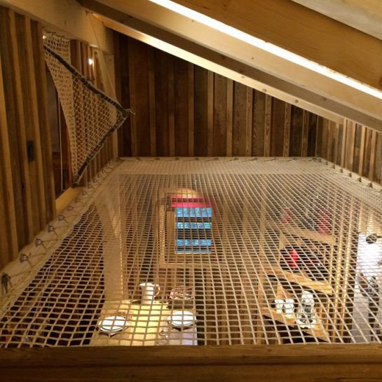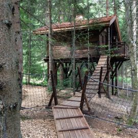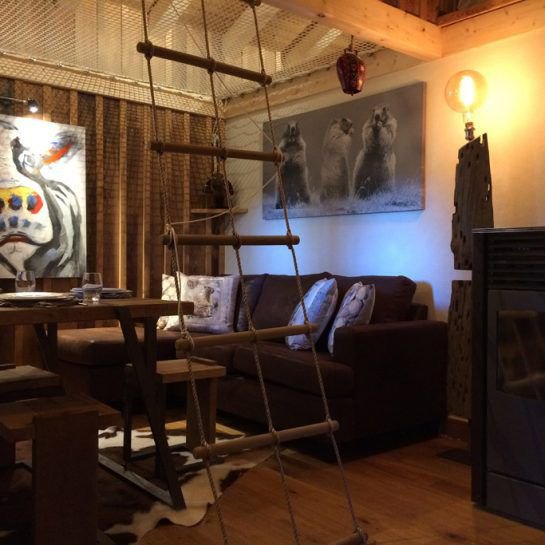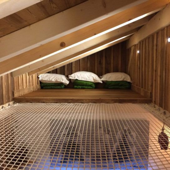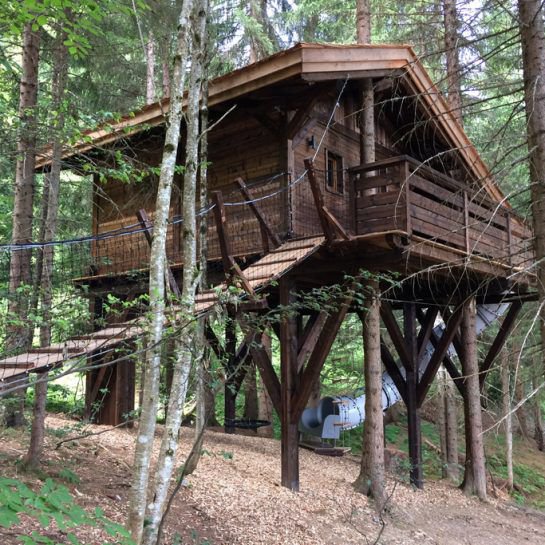 Perchés à 5 mètres après avoir franchi un pont de singe de 12 mètres de long, vous admirerez la vue sur la montagne depuis la Cabane du Ruisseau. A l'intérieur, vous profiterez de la douceur de la chaleur du poêle à pellets lors des soirées d'hiver. Cette cabane saura ravir petits et grands avec son toboggan tubulaire menant à l’espace ludique abrité sous la cabane ou encore son filet horizontal en hauteur pour une nuit des plus insolites !
