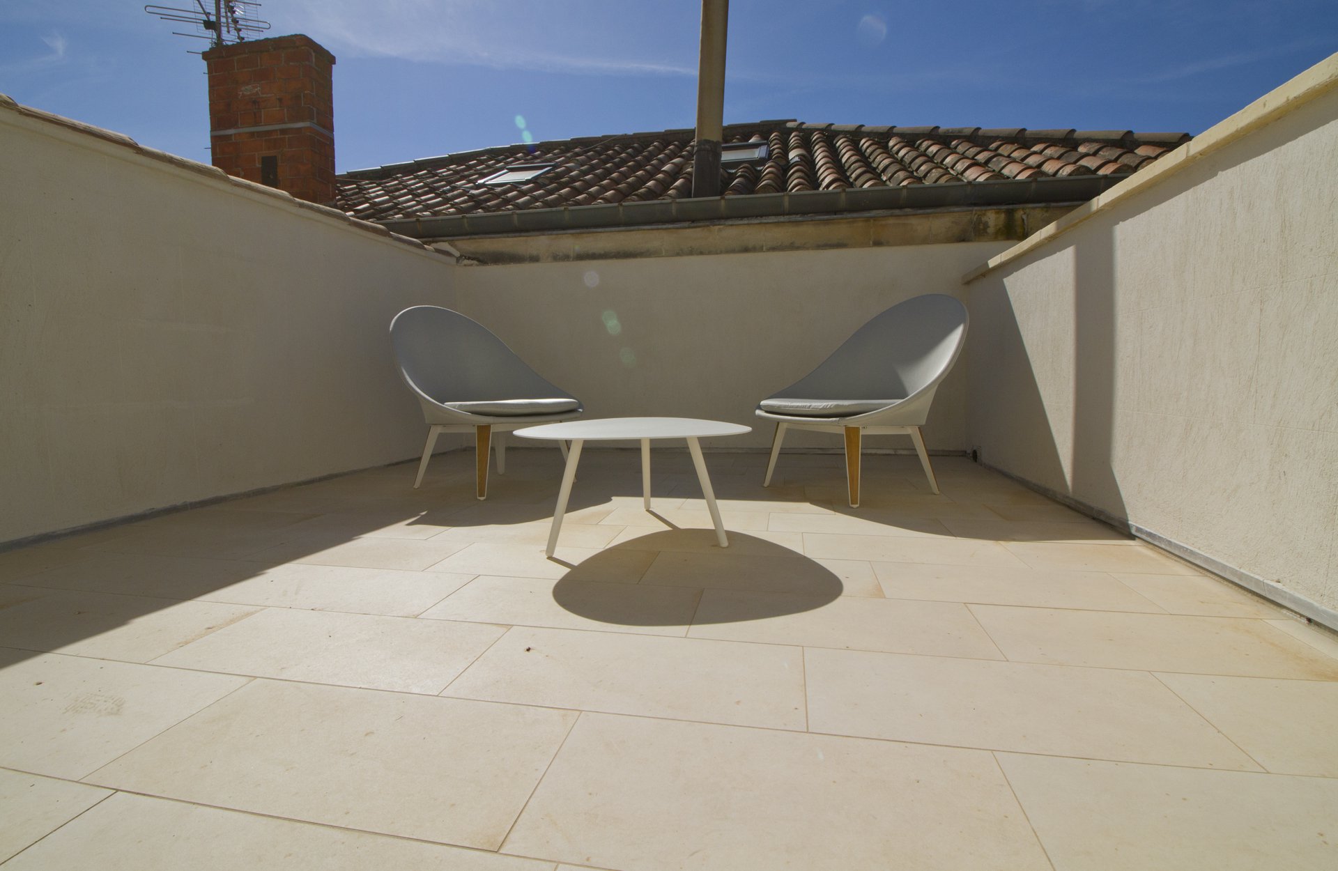 Cette suite possède sa propre terrasse privée idéalement orientée à l’Ouest pour profiter du soleil du Sud et offrant une vue sur les toits de Nîmes.